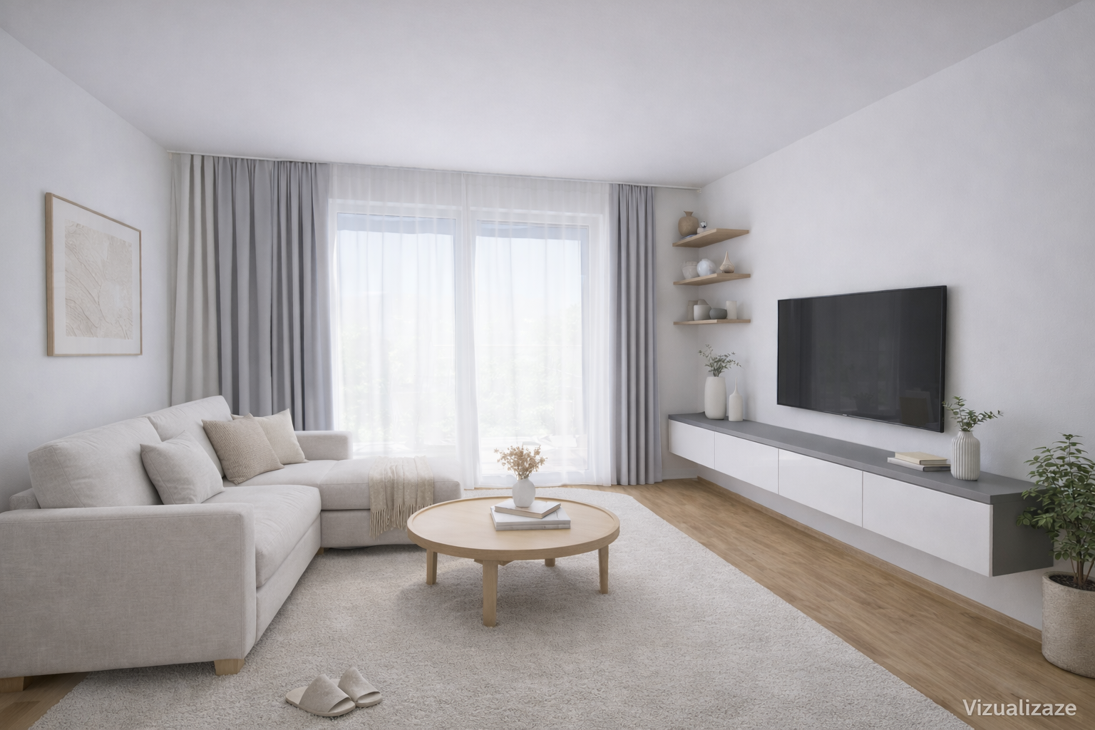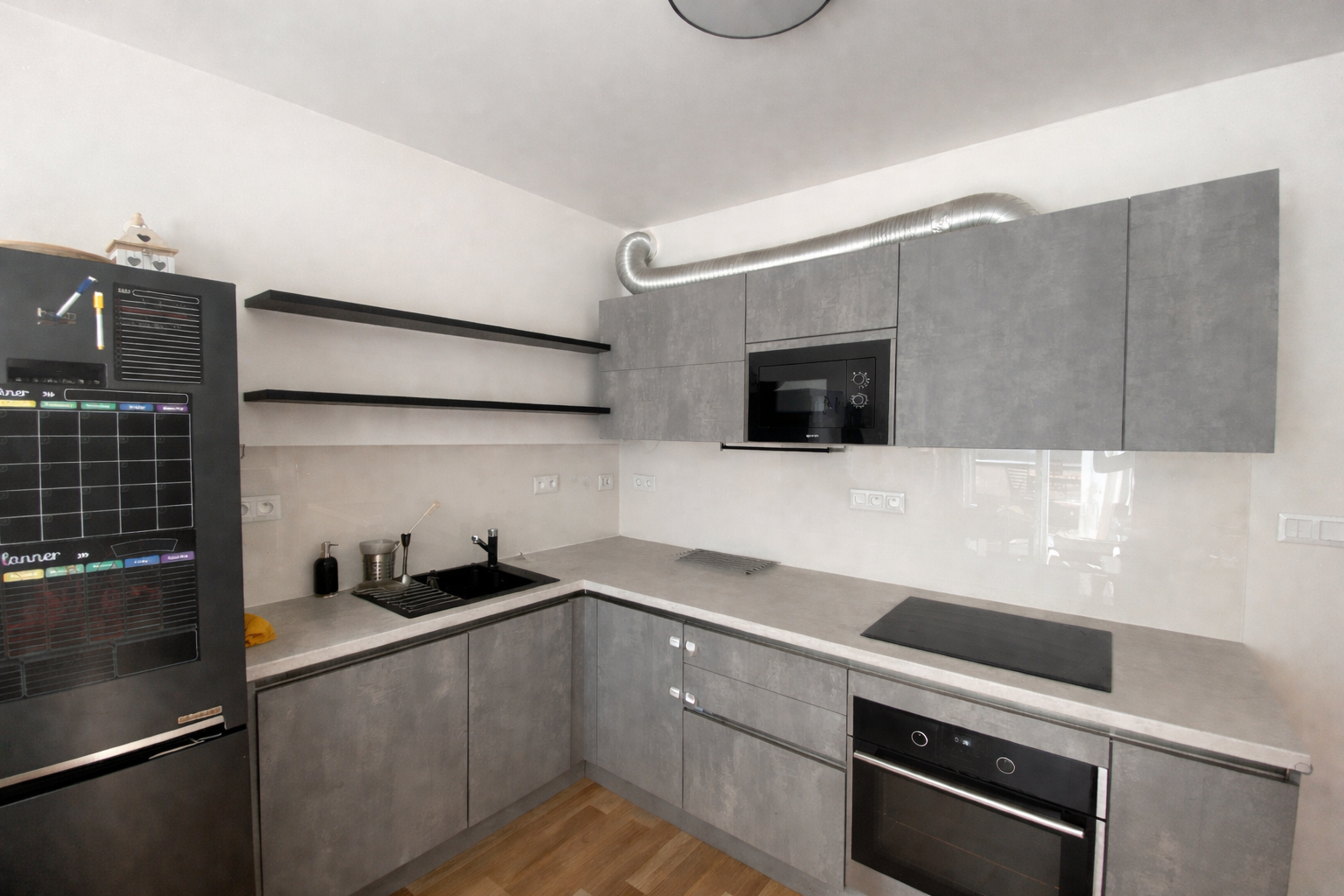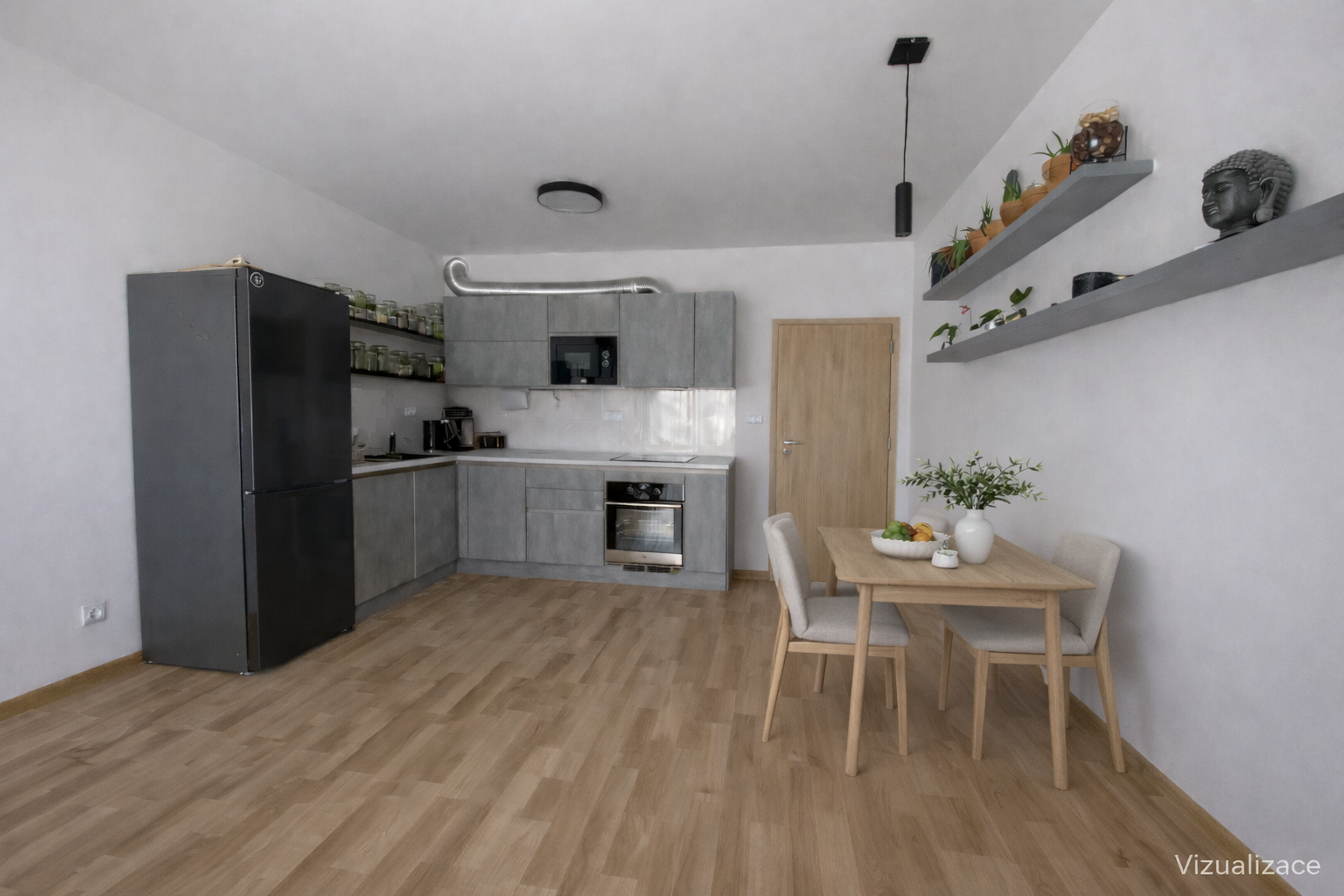 Byt sestává ze vstupní chodby (s vestavnou skříní a botníkem), koupelny (poličky a skříň s umyvadlem od truhláře), komory (pro umístění pračky se sušičkou a vestaveným regálem pro skladování potravin a drogerie), ložnicí s vestavěnou skříní, obývacím pokojem (truhlářské tuplované police a na míru dělaná televizní skříňka) s kuchyňským koutem (mikrovlnka, lednice, myčka, trouba).