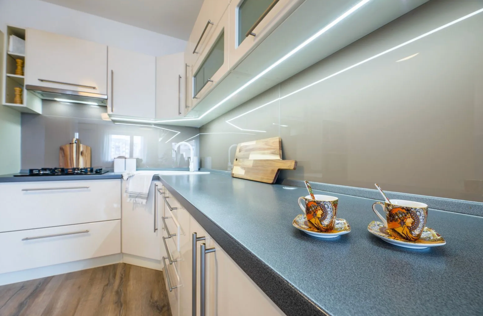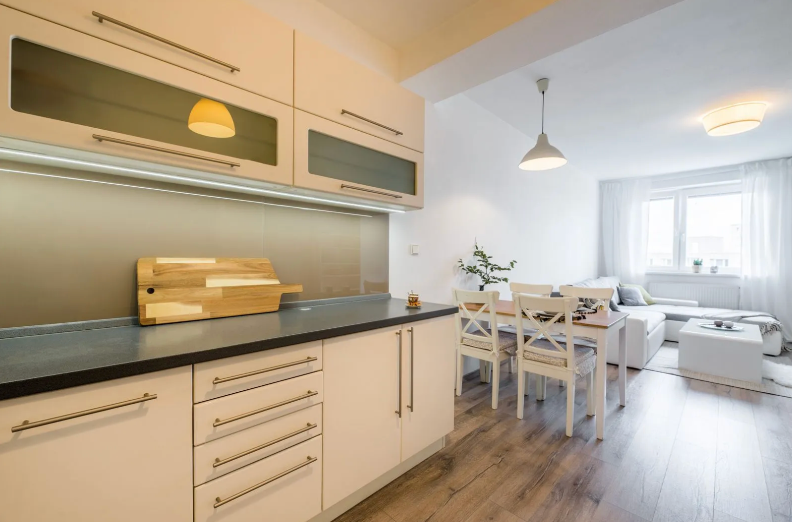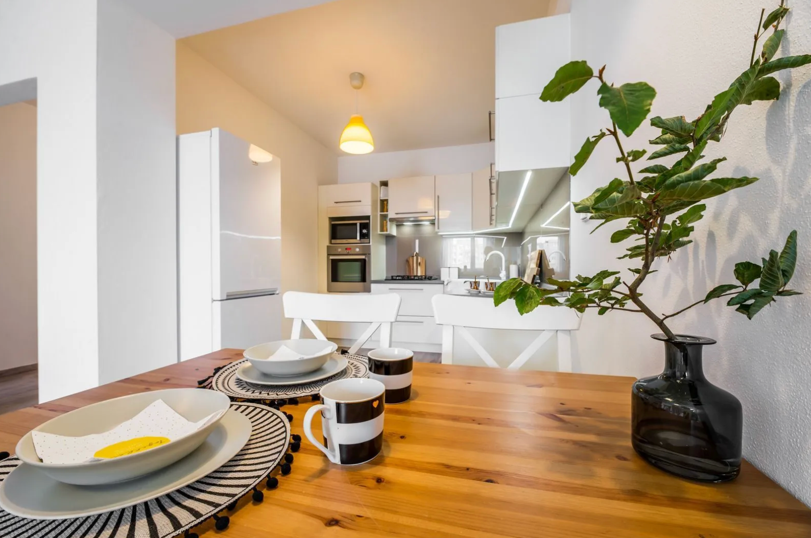 -Kuchyňa: Linka na mieru so spotrebičmi (plynová varná doska, teplovzdušná rúra, umývačka riadu, chladnička s mrazničkou, mikrovlnná rúra, uhlíkový digestor).