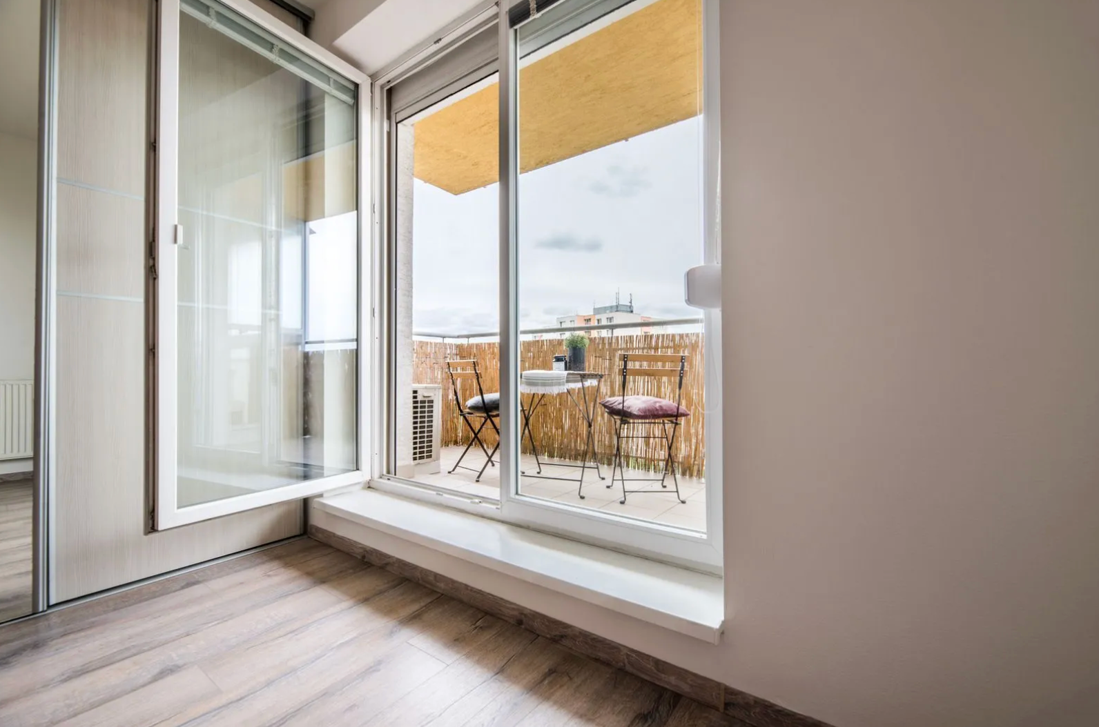-Interiér: Stierky a plávajúca podlaha v celom byte, keramická dlažba v kúpeľni.