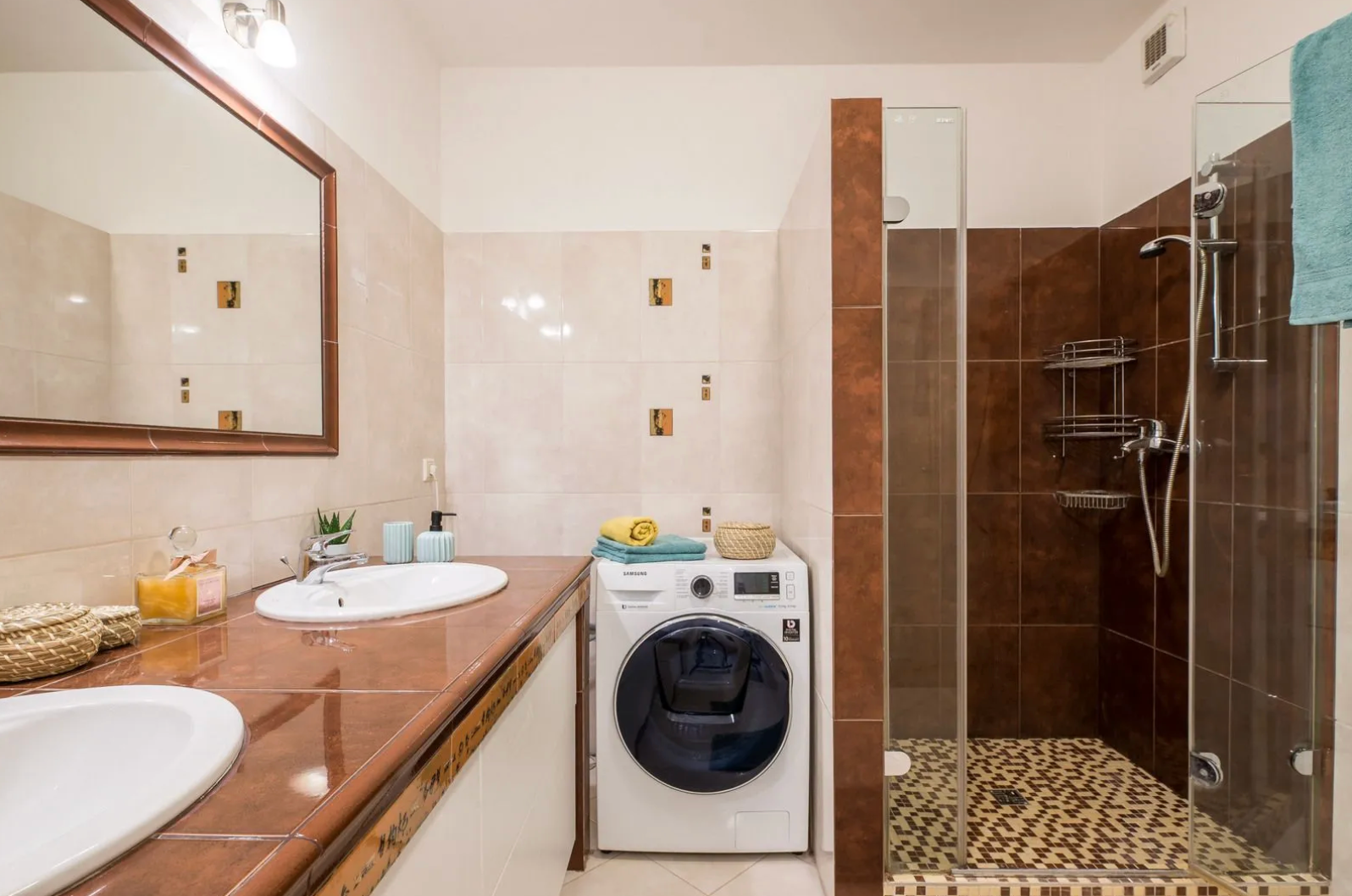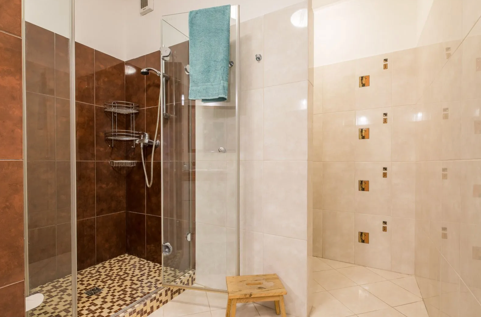 -Kúpeľňa: Vybavená 2 umývadlami, sprchovým kútom, rebríkovým radiátorom a odsávaním. WC je čiastočne oddelené (s možnosťou jednoduchého úplného oddelenia).