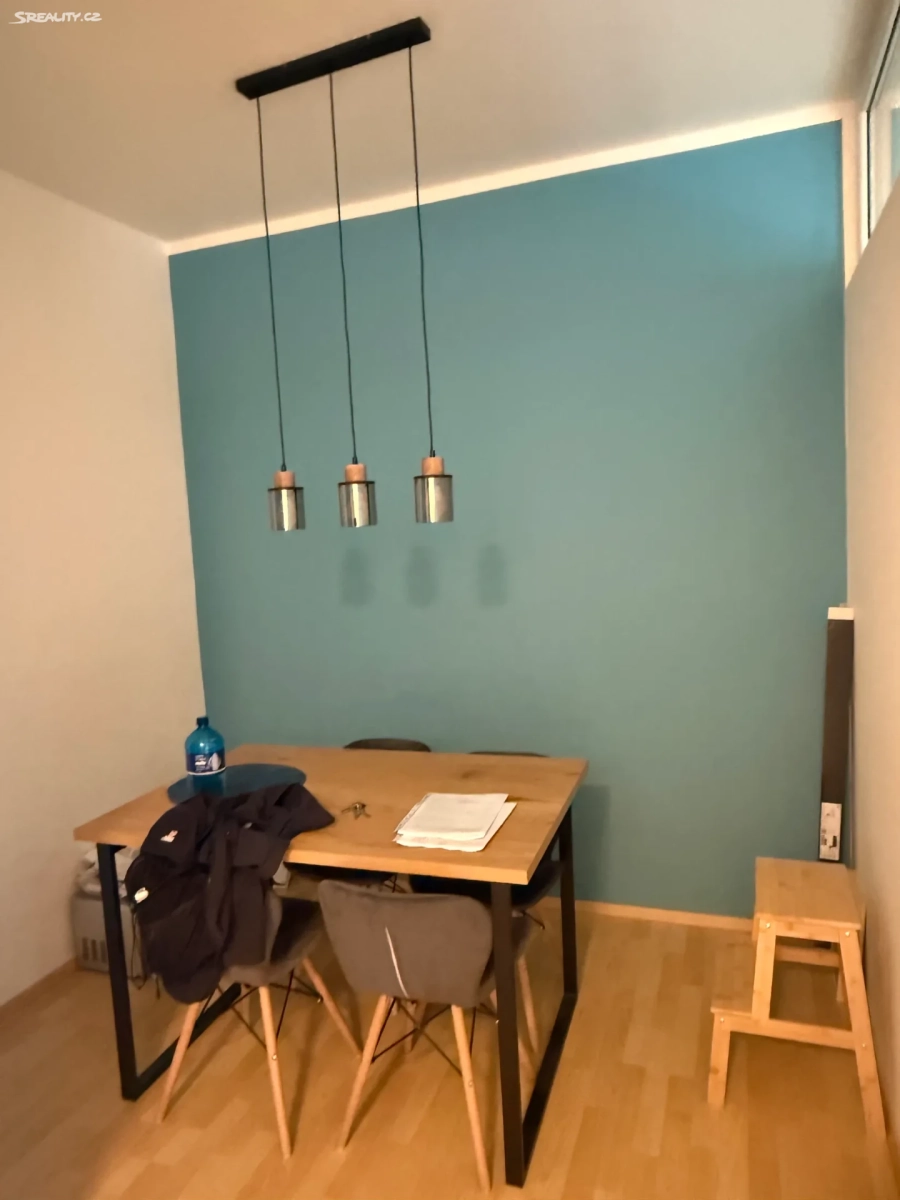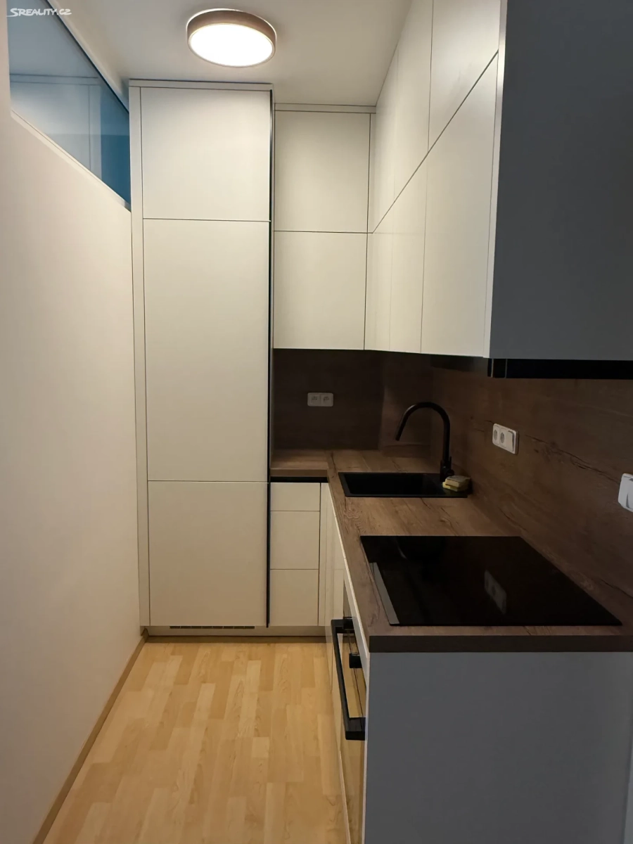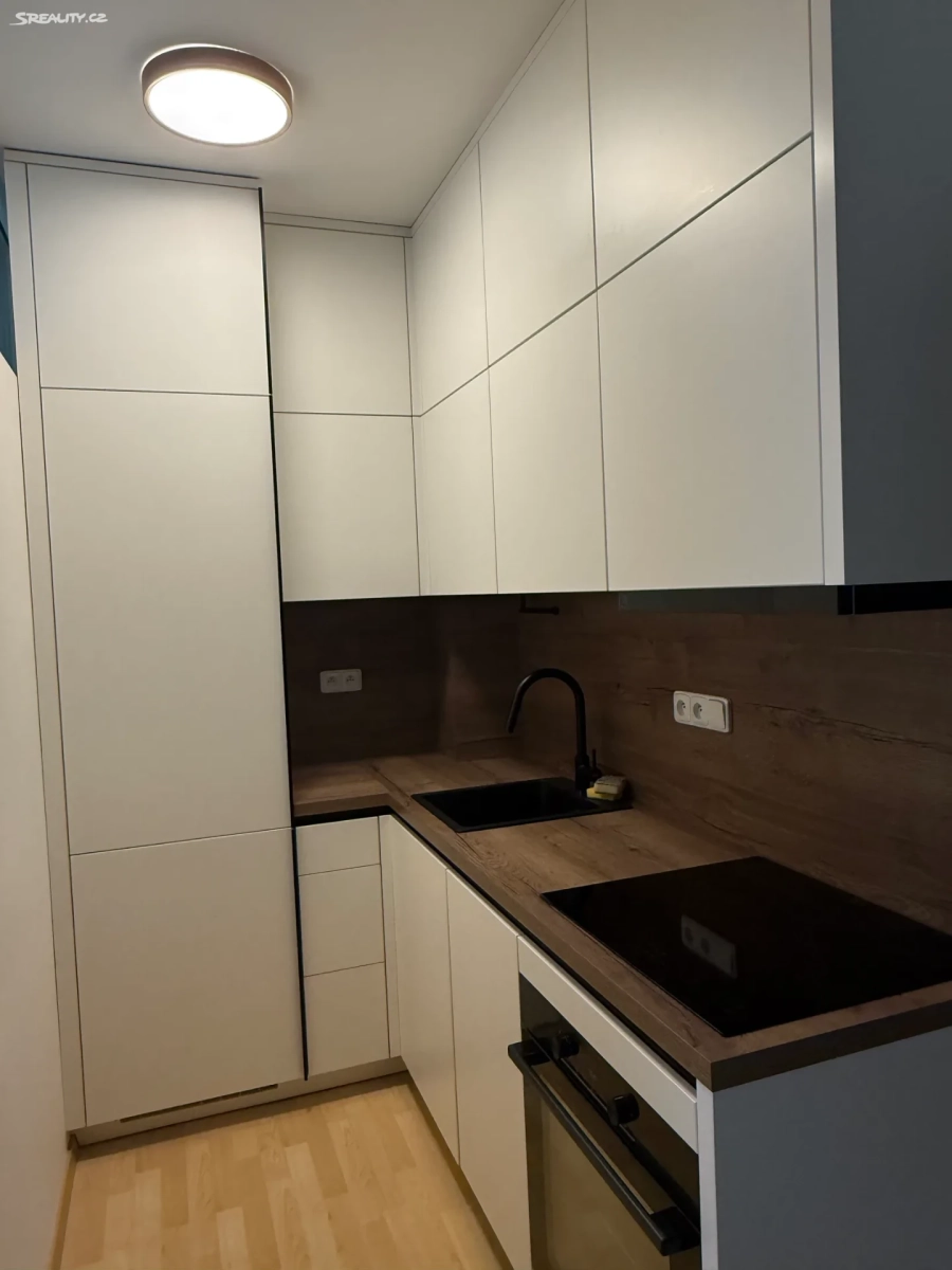 Kuchyň je moderní a vybavená novými spotřebiči včetně úsporné lednice, navazuje na jídelní část se stolem. Obývací pokoj je zařízen gaučem a nabízí příjemný výhled do okolní zástavby. Samozřejmostí je moderní koupelna.