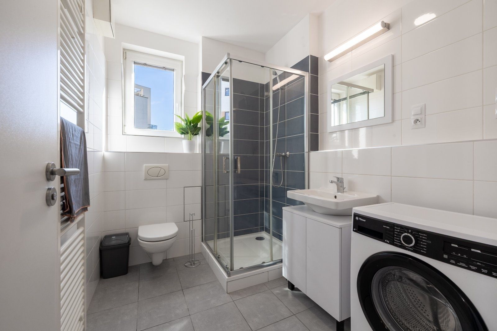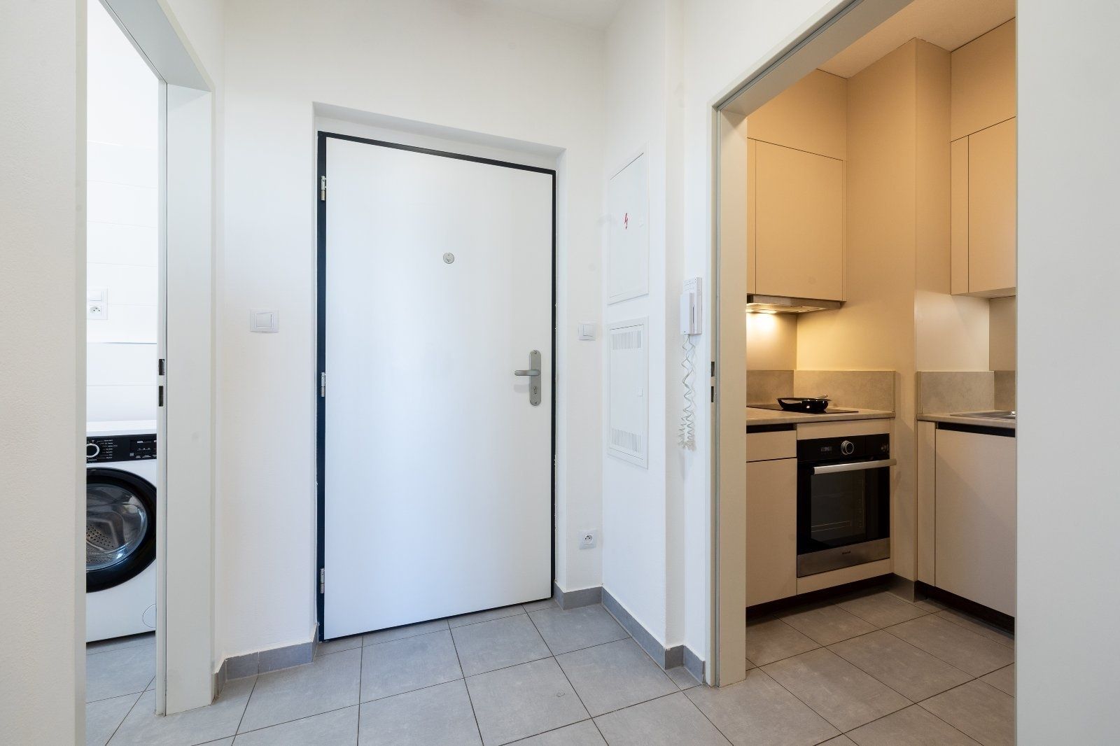 Koupelna disponuje vlastní pračkou. V přízemí domu je zároveň k dispozici společná prádelna s další pračkou a sušičkou za poplatek. Dům je vybaven výtahem a je zde možnost pronájmu garážového stání.