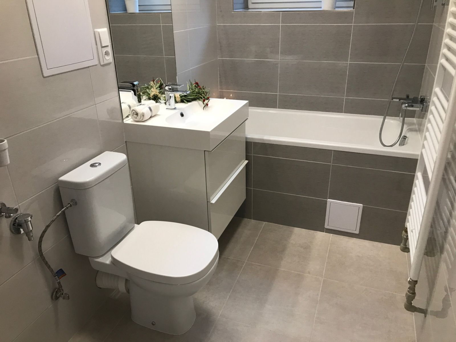 Koupelna je zděná, s oknem, vanou a toaletou.