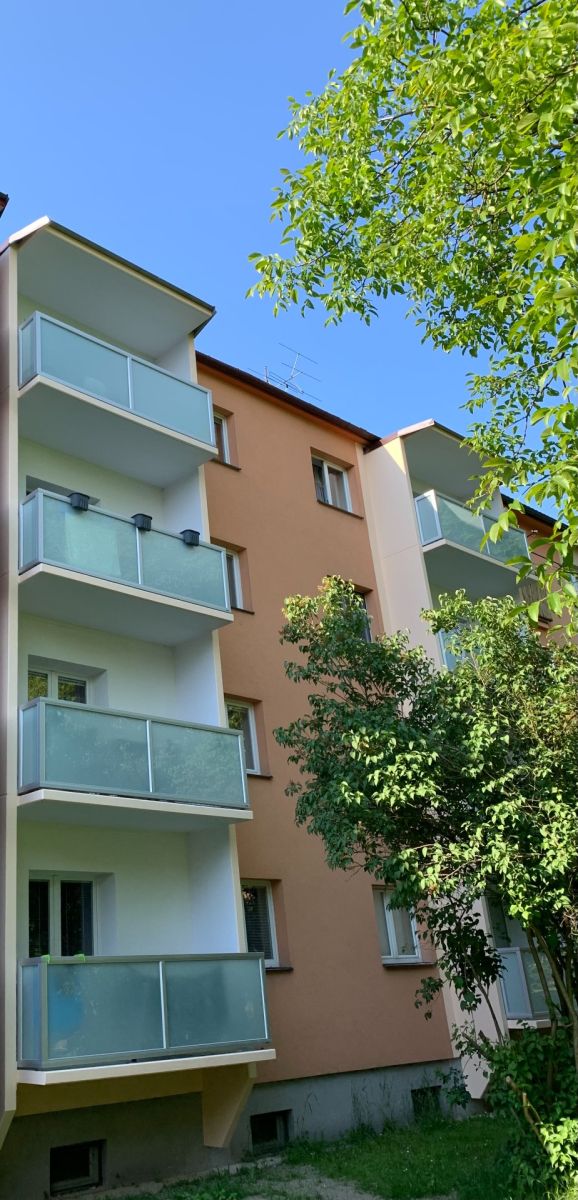 Byt je velmi slunný, disponuje francouzským oknem a zaskleným balkonem, a nachází se ve 2. patře třípatrového cihlového domu po kompletní revitalizaci (plastová okna, zateplení, nová fasáda).