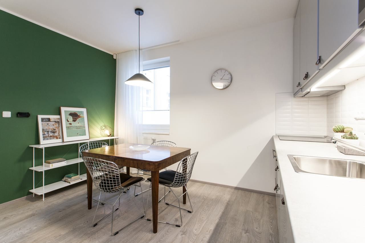 Apartment on the second floor is decorated in a combination of white, gray and green color, and therefore has a very pleasant atmosphere. The largest room is the living room with kitchenette. In the evening you can lie back on the couch or make yourself comfortable on a padded chair and watch your favorite movie on TV. The kitchen is very well equipped. In the morning you heat a frying pan on an electric hob, break a few eggs and you have a wonderful breakfast. Lunch you can put in the oven and the dinner can be warmed up in the microwave. While cooking you can use a wooden dining table as an additional workspace. You don´t need to worry about the dirty dishes anymore. The kitchen is equipped with a dishwasher!