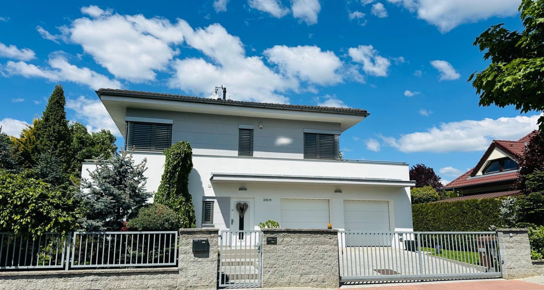 Příslušenství domu tvoří dvougaráž (37,6m2) s přímým vstupem do domu i na zahradu. Garáž je osazena elektricky ovládanými lamelovými vraty. Před garáží lze pohodlně zaparkovat další dva vozy. Oplocení je z pozinkovaného materiálu, bezúdržbové a s pojízdnou bránou na dálkové ovládání.