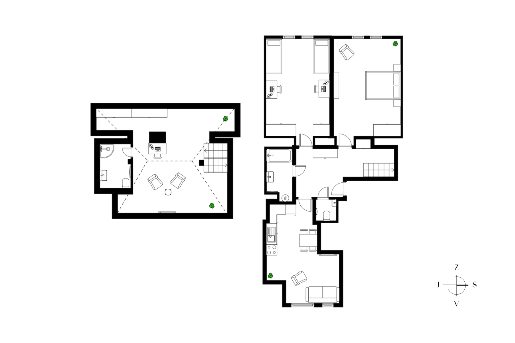The unit itself underwent a complete renovation five years ago and offers a well-designed duplex space. The lower level features a spacious living room with a kitchenette, two separate rooms, a bathroom with a bathtub, a separate toilet, and an entrance hall with storage space. In the attic, there is an open area ideal for use as a study or studio, along with a second bathroom equipped with a shower and toilet.