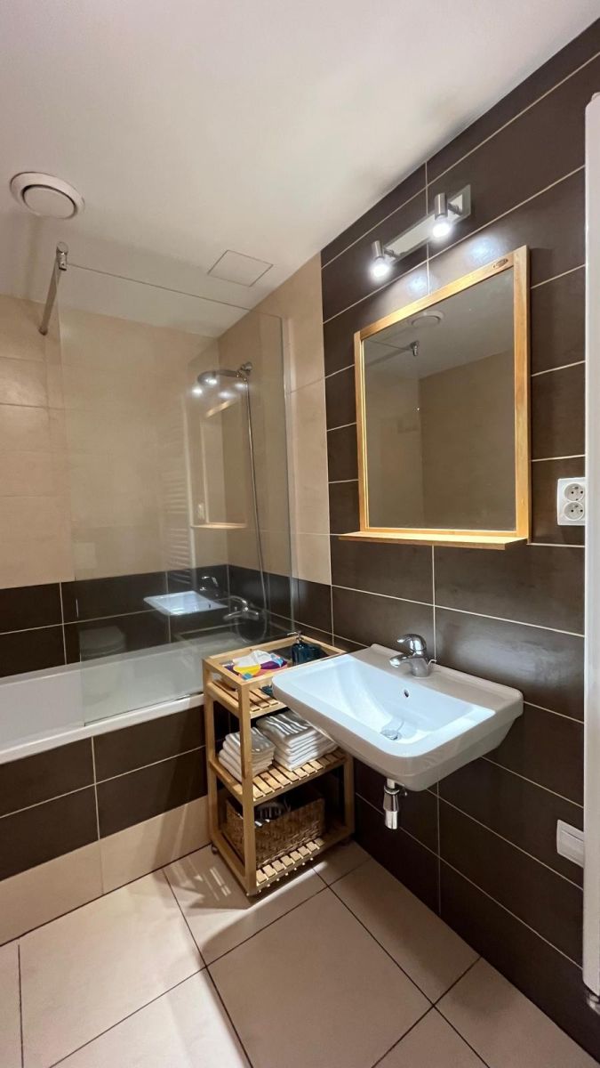 Koupelna disponuje vanou se skleněnou zástěnou, díky které může sloužit i jako pohodlný sprchový kout. Toaleta je součástí koupelny.